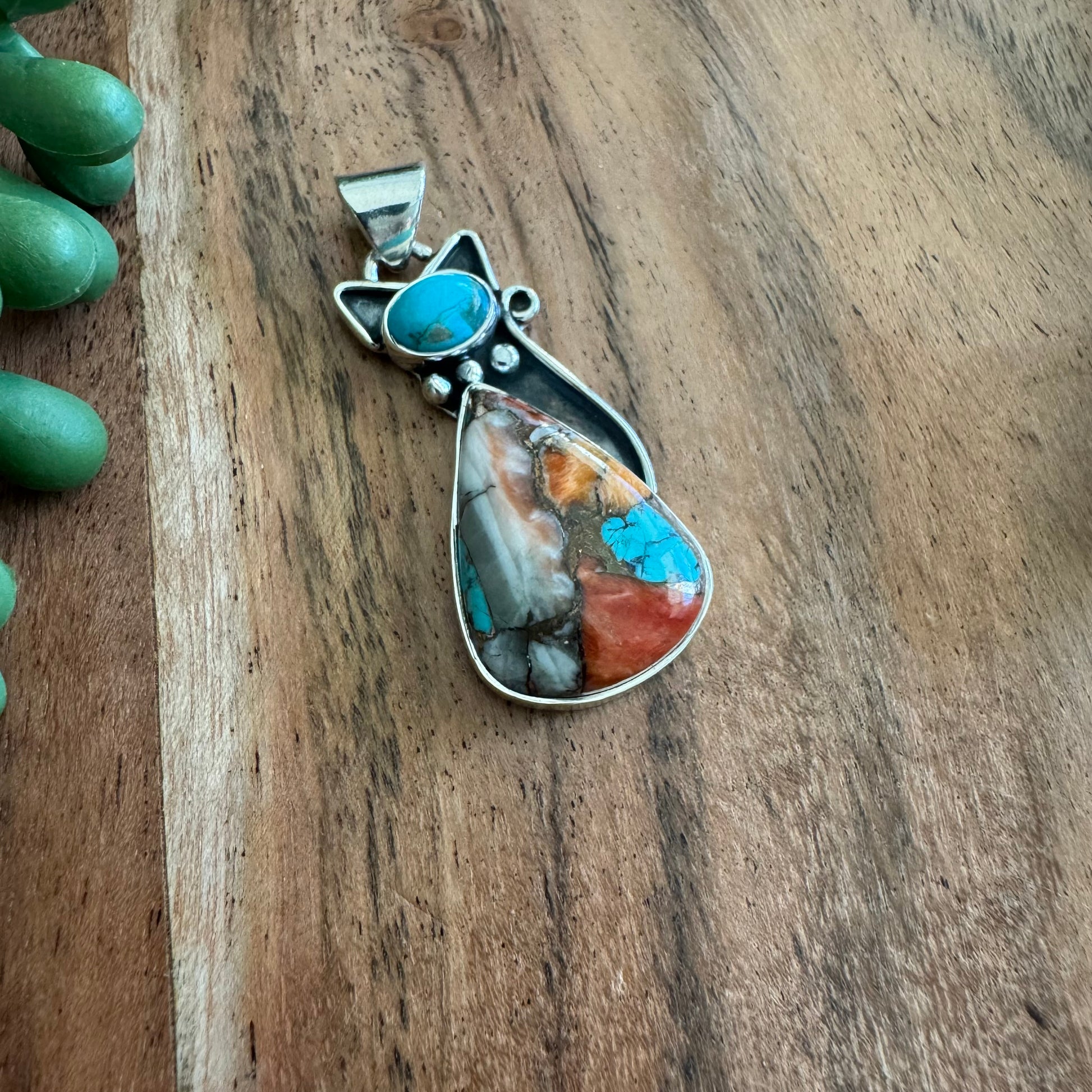 Playful and eye-catching, this cat-shaped pendant features two vibrant stones of orange spiny oyster shell and turquoise—one set in the belly and the other for the face. Crafted in polished sterling silver, this unique design is perfect for cat lovers and collectors of fun, whimsical jewelry.