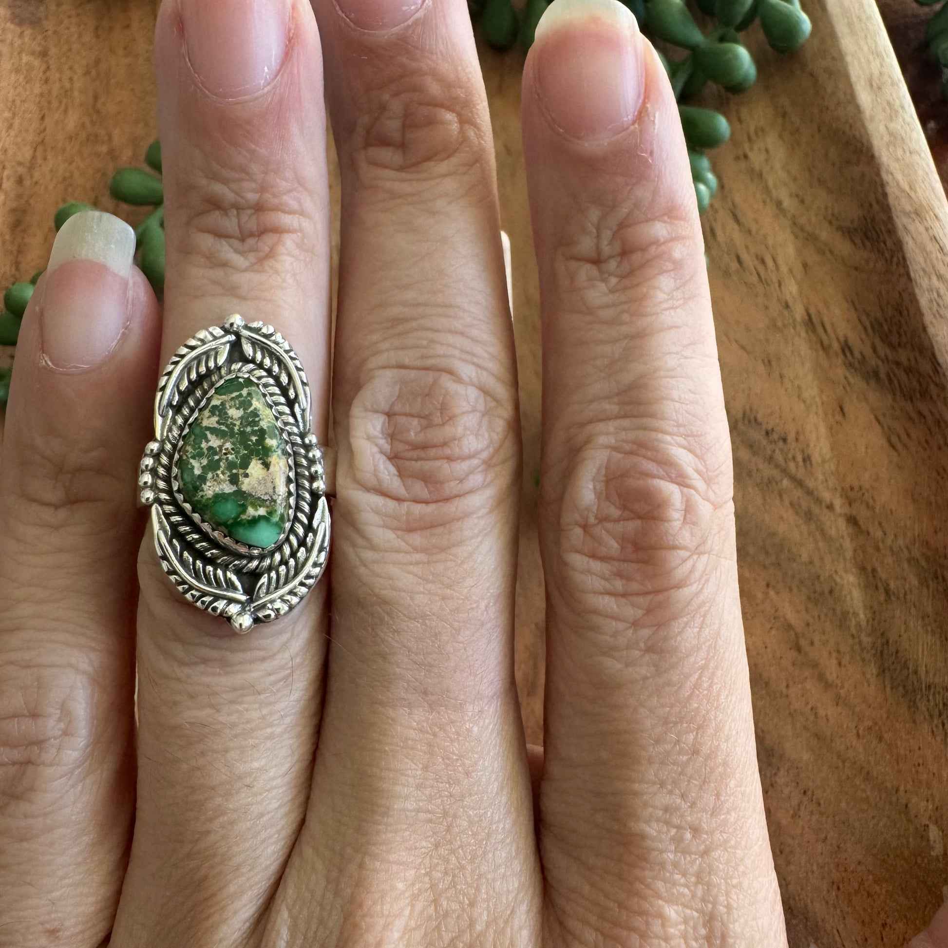 This sterling silver ring features a stunning Emerald Valley turquoise stone set in a Southwest-inspired design with intricate leaf detailing. The rich blue-green tones of the turquoise beautifully contrast with the polished silver, creating a timeless and elegant piece.