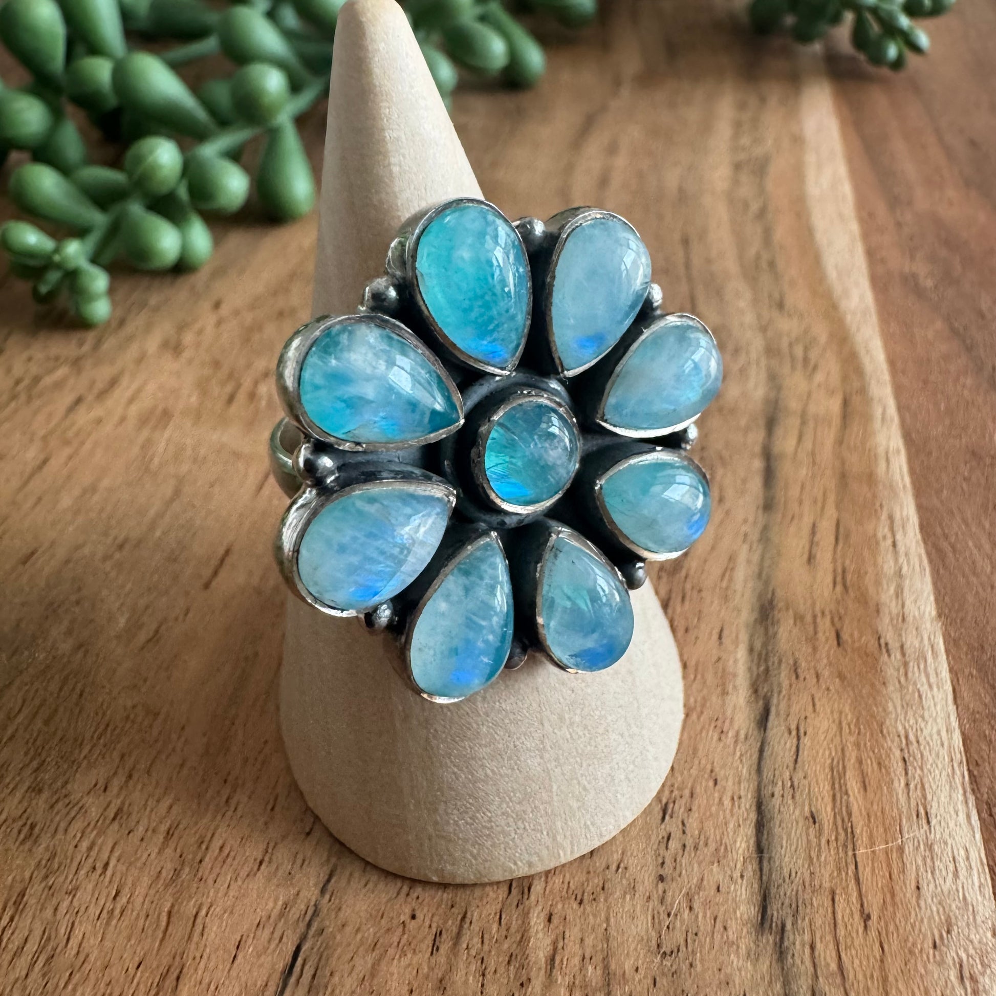 This sterling silver and green/blue moonstone ring is a breathtaking statement of elegance and l beauty. The design features eight pear-shaped green moonstones encircling a central round moonstone, forming a delicate flower pattern that shimmers with soft, ethereal glow. Each stone radiates gentle flashes of green and silvery light, giving the ring an almost magical quality.