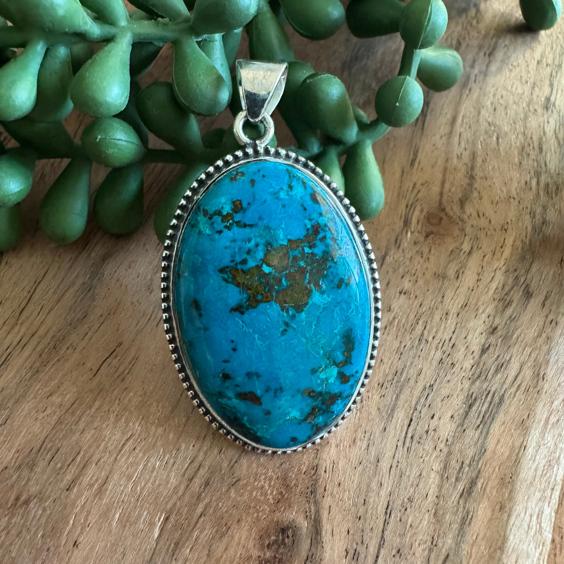 This bold and beautiful pendant features an approximately 46 mm oval Shattuckite gemstone in a striking teal blue color reminiscent of turquoise. Known for its vibrant hues and unique patterns, Shattuckite is a captivating stone that makes a true statement in any jewelry collection. The polished sterling silver setting provides a sleek frame, allowing the gemstone’s natural beauty to shine.