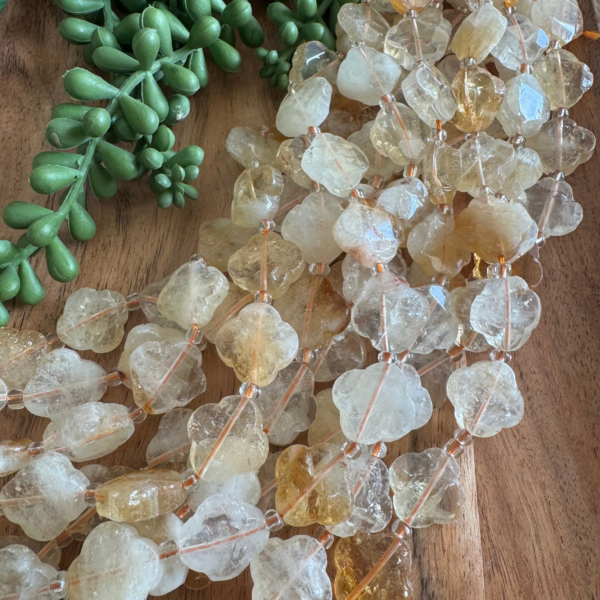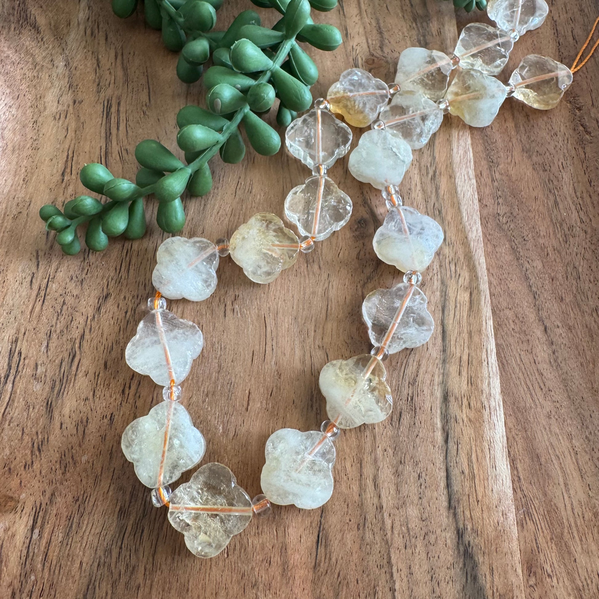 This 15 inch strand features beautifully crafted citrine gemstone beads in a striking quatrefoil (clover) shape. Each bead measures approximately 18 mm, showcasing warm golden tones and exceptional craftsmanship. The unique shape makes these beads perfect for statement jewelry designs and elegant accents.