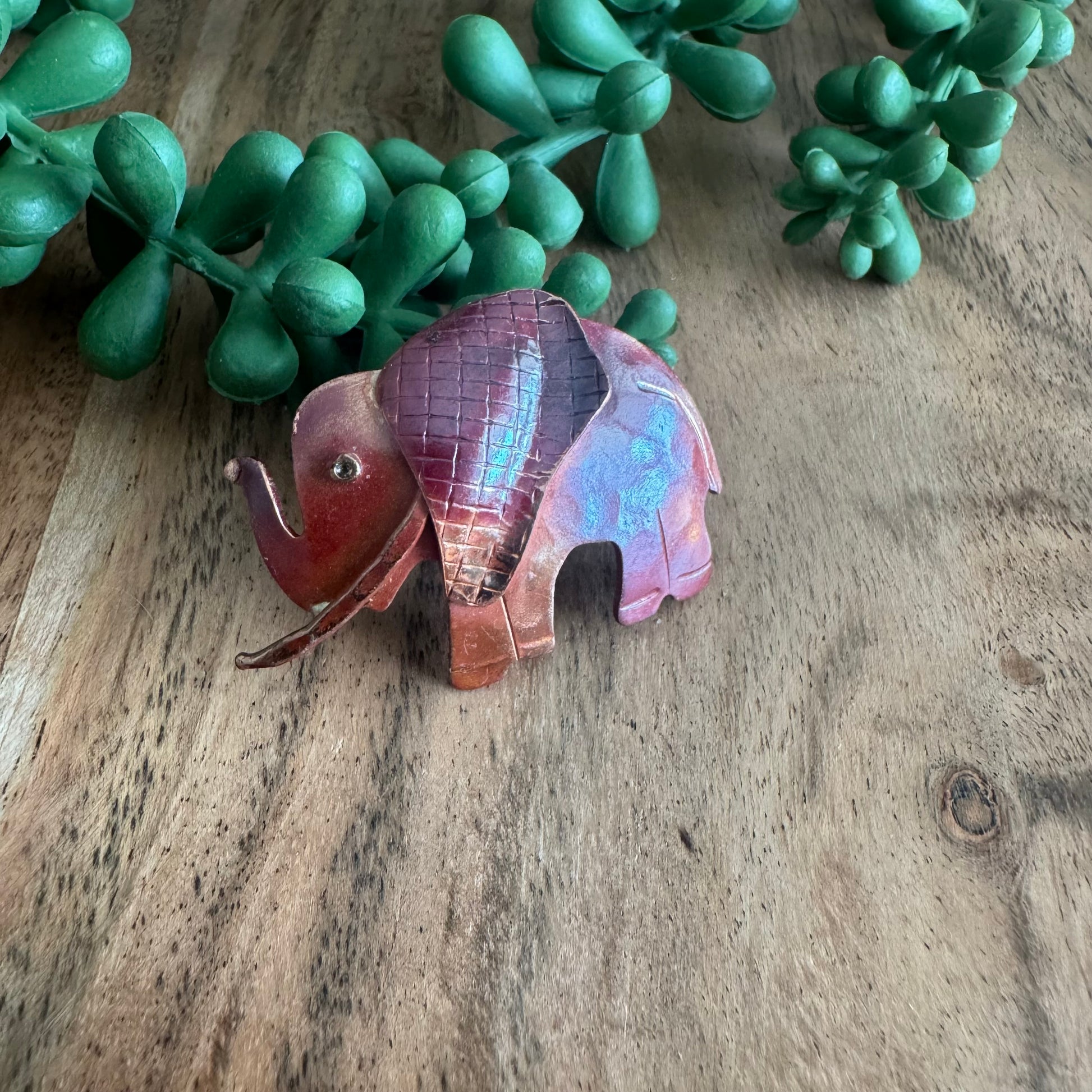 This artisan slifer features a charming elephant design crafted from genuine copper with brass accents. Measuring approximately 1 1/8 inches in height and 1 3/8 inches in width, each piece is handmade and finished to create unique variations in color and texture.