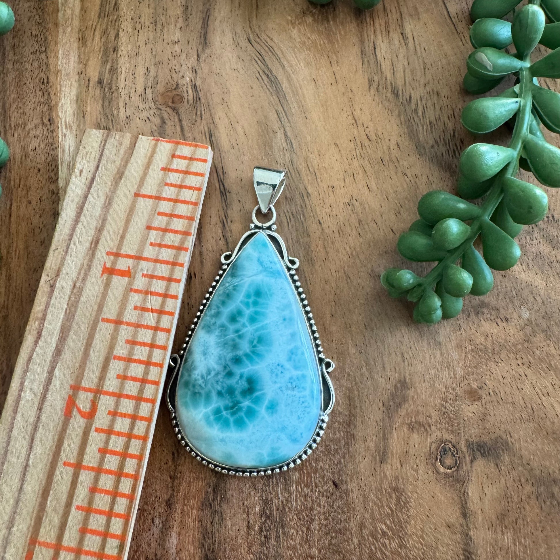 This absolutely stunning Larimar pendant captures the serene blues of the Caribbean Sea. The drop shaped stone is beautifully encased in .925 sterling silver, allowing its natural beauty to shine. Measuring approximately 53mm long and 33mm wide (not including the bail), it’s a statement piece that radiates calm and elegance.