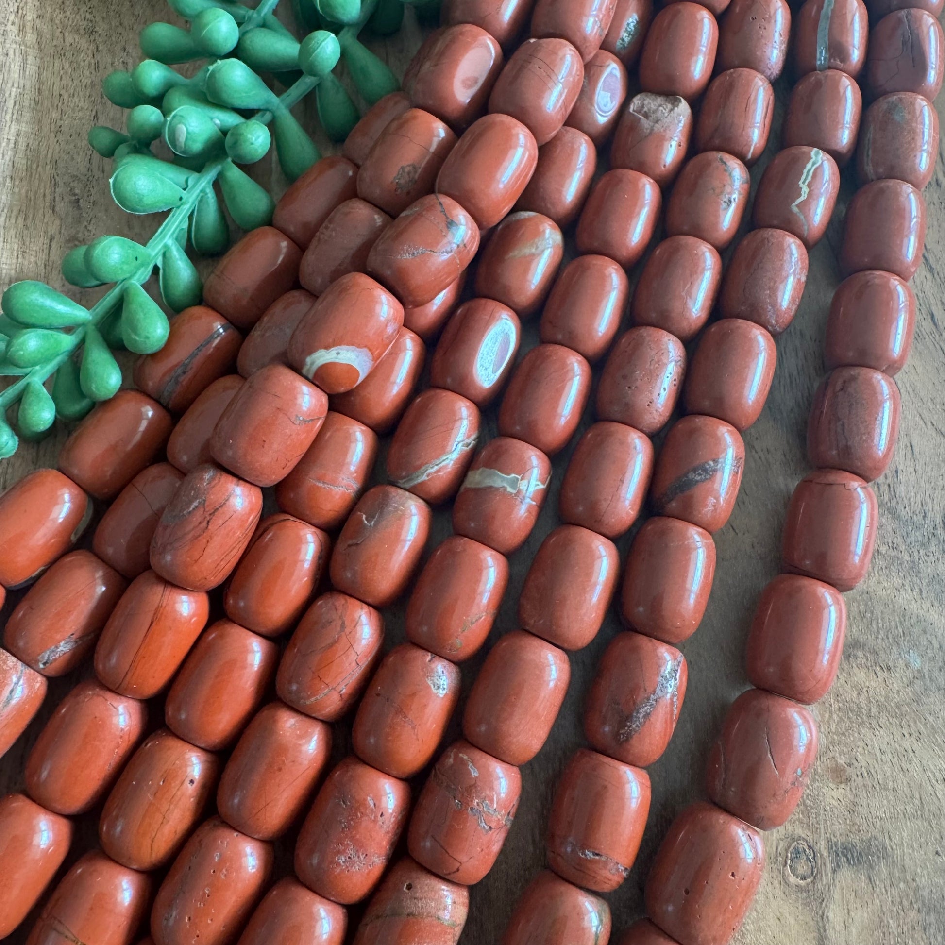 This beautiful strand features barrel shaped red jasper. Each bead measures approximately 12x16mm, and the strand is about 15 inches long, offering plenty of material for necklaces, bracelets, or other jewelry projects. The patterns in the jasper create unique variations from bead to bead, adding depth and character to your designs.