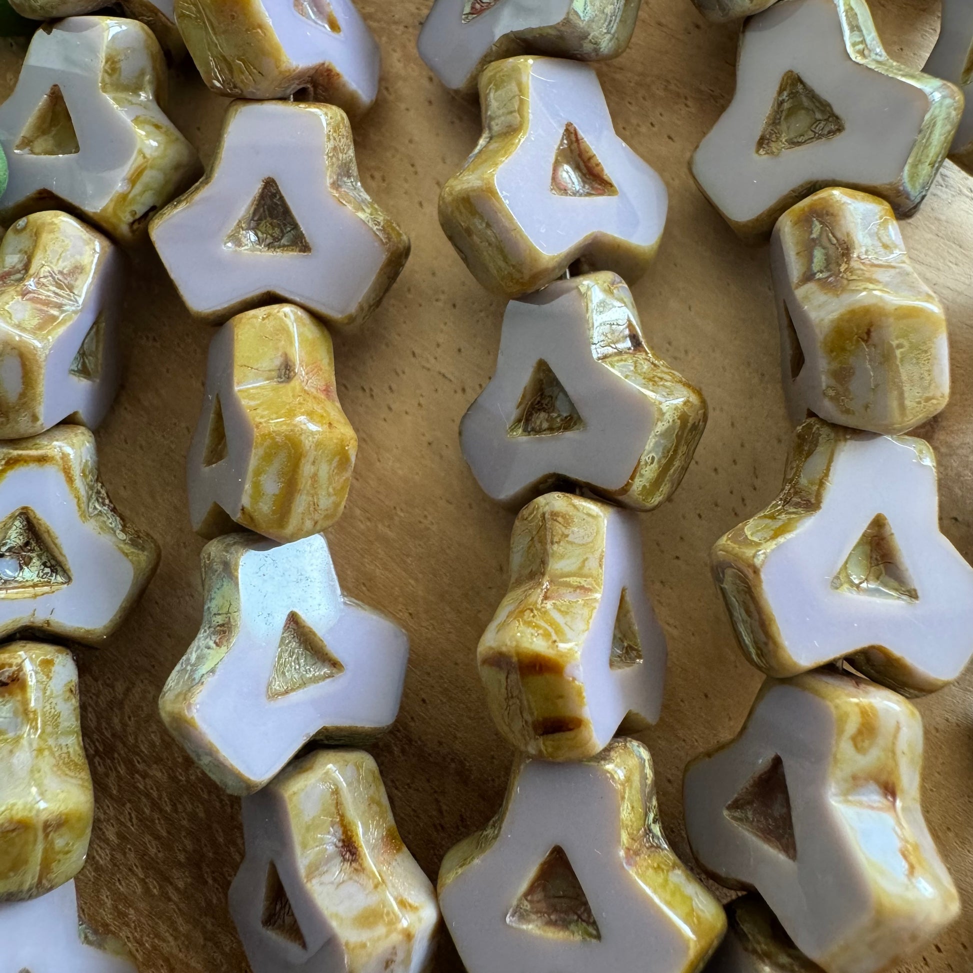 These vintage Czech glass beads feature a highly distinctive geometric form with crisp table-cut detailing and a soft light lilac tone with Picasso finish on the edges.